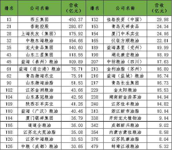 11月初,2020年中國農(nóng)業(yè)企業(yè)500強(qiáng)榜單發(fā)布。今年評定主要參考營業(yè)收入和利潤,按照2018年企業(yè)營業(yè)收入進(jìn)行排名,入圍門檻為5億元,全國28個?。ㄊ?、區(qū))參與排名,其中營業(yè)收入過百億的農(nóng)業(yè)企業(yè)有49家。有多家主營業(yè)務(wù)為食用油或涵蓋食用油的企業(yè)上榜,這些企業(yè)油脂加工能力、經(jīng)營規(guī)模都較強(qiáng),在行業(yè)內(nèi)具有較大的影響力。雖然該榜單依據(jù)的是2018年營收數(shù)據(jù),有些實(shí)力油企并未納入?yún)⒃u,但由于統(tǒng)計數(shù)據(jù)往往滯后,而且2019年存在貿(mào)易戰(zhàn)影響的因素,一些企業(yè)的正常經(jīng)營受到干擾影響,因此該榜單仍具有相當(dāng)?shù)膮⒖夹浴?/span>