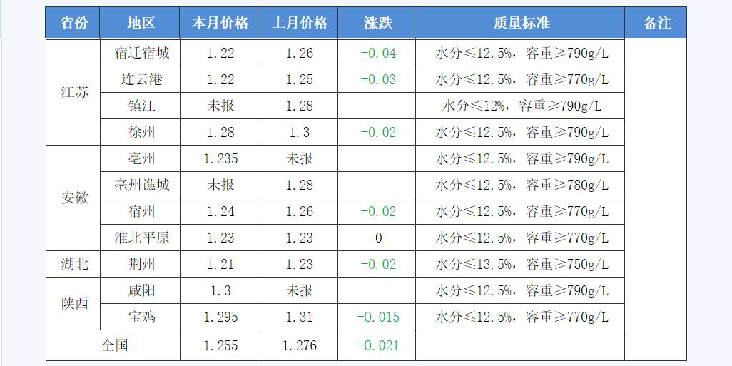 本月國(guó)內(nèi)小麥價(jià)格滯漲回落。截止月末,全國(guó)小麥平均價(jià)格數(shù) 為1.255元/斤,較上月跌0.021元/斤,國(guó)內(nèi)主產(chǎn)區(qū)面粉企業(yè)小麥?zhǔn)?/span>購(gòu)價(jià)在1.21-1.30元/斤,較上月波動(dòng)0.005-0.04元/斤。