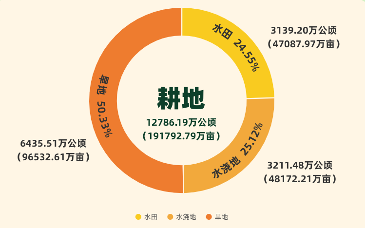《公報(bào)》顯示:我國(guó)耕地19.18億畝,其中水田4.71億畝,占24.55%;水澆地4.81億畝,占25.12%;旱地9.65億畝,占50.33%。64%的耕地分布在秦嶺—淮河以北。黑龍江、內(nèi)蒙古、河南、吉林、新疆等五個(gè)省份耕地面積較大,占全國(guó)耕地的40%。位于一年三熟制地區(qū)的耕地2.82億畝,占全國(guó)耕地的14.73%;位于一年兩熟制地區(qū)的耕地7.17億畝,占37.40%;位于一年一熟制地區(qū)的耕地9.18億畝,占47.87%。