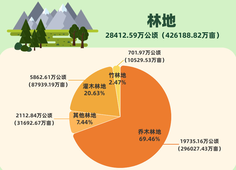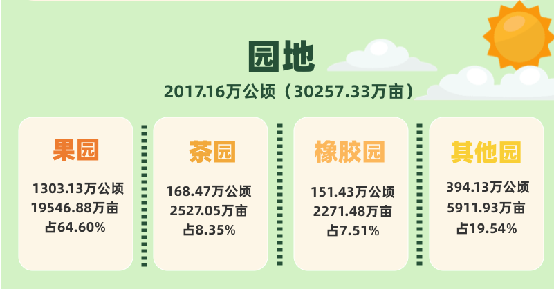 《公報(bào)》還顯示:我國(guó)園地面積3.03億畝。其中果園1.95億畝,占64.60%;茶園0.25億畝,占8.35%。草地39.68億畝。其中天然牧草地31.98億畝,占80.59%;人工牧草地0.09億畝,占0.22%。林地42.62億畝。濕地3.52億畝。城鎮(zhèn)村及工礦用地5.3億畝。其中村莊用地3.29億畝,占62.13%。交通運(yùn)輸用地1.43億畝。其中農(nóng)村道路0.71億畝,占49.88%。水域及水利設(shè)施用地5.44億畝。其中水庫(kù)水面0.51億畝,占9.28%;坑塘水面0.96億畝,占17.69%;溝渠0.53億畝,占9.69%。