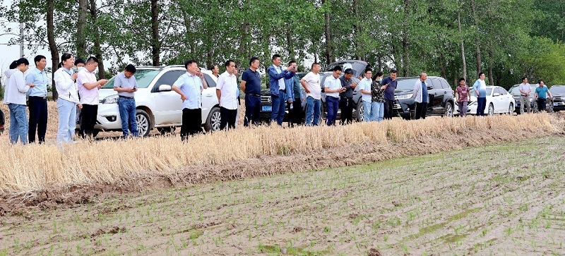 與會人員先后觀摩了黃海分公司玉米大豆帶狀復(fù)合種植播種、出苗現(xiàn)場以及水稻栽插現(xiàn)場,聽取有關(guān)情況介紹。