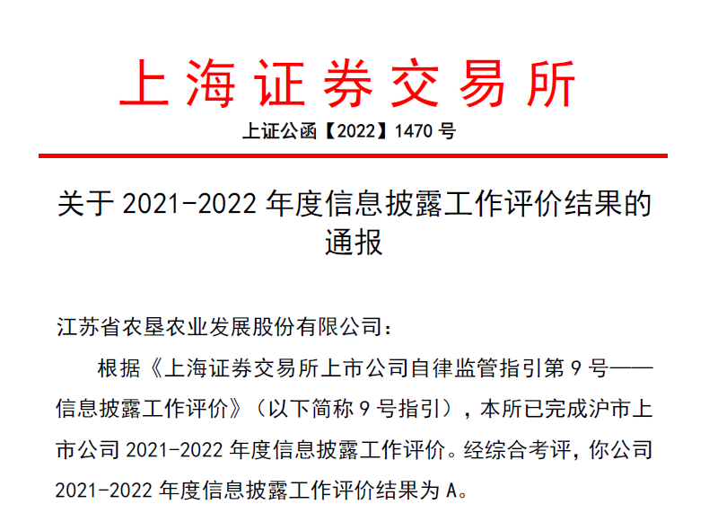 近日,上海證券交易所公布滬市主板上市公司2021-2022年度信息披露工作評(píng)價(jià)結(jié)果,蘇墾農(nóng)發(fā)(股票代碼:601952)獲評(píng)最高等級(jí)“A”級(jí),這是蘇墾農(nóng)發(fā)連續(xù)第三年獲得信息披露工作最高等級(jí)評(píng)價(jià)。