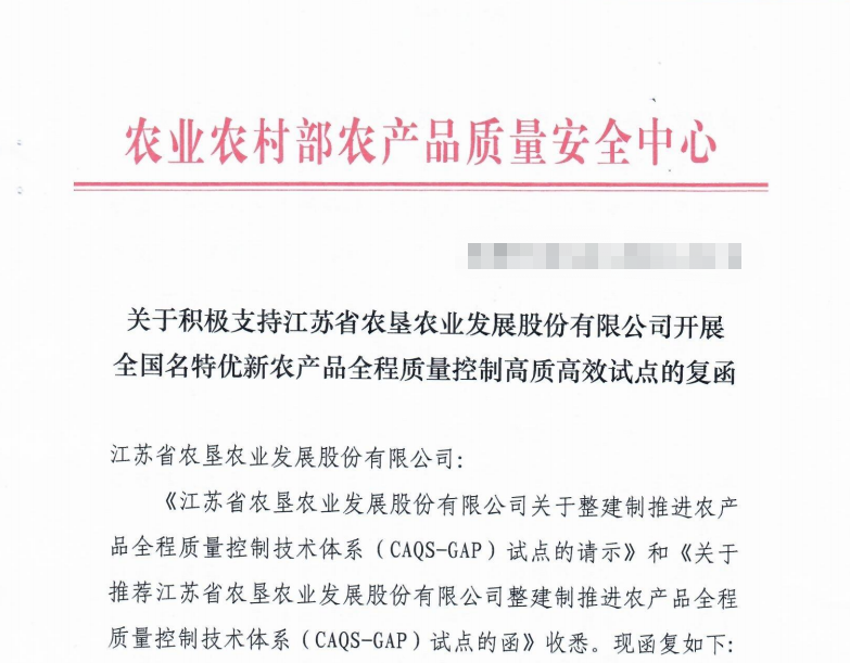 近日,農(nóng)業(yè)農(nóng)村部農(nóng)產(chǎn)品質(zhì)量安全中心正式復(fù)函批復(fù)江蘇省農(nóng)墾農(nóng)業(yè)發(fā)展股份有限公司(簡稱:蘇墾農(nóng)發(fā))積極支持開展全國名特優(yōu)新農(nóng)產(chǎn)品全程質(zhì)量控制高質(zhì)高效試點(diǎn)。蘇墾農(nóng)發(fā)成為全國第二家、江蘇省第一家整建制獲批推進(jìn)農(nóng)產(chǎn)品全程質(zhì)量控制技術(shù)體系(CAQS-GAP)試點(diǎn)單位的企業(yè)。