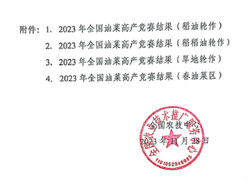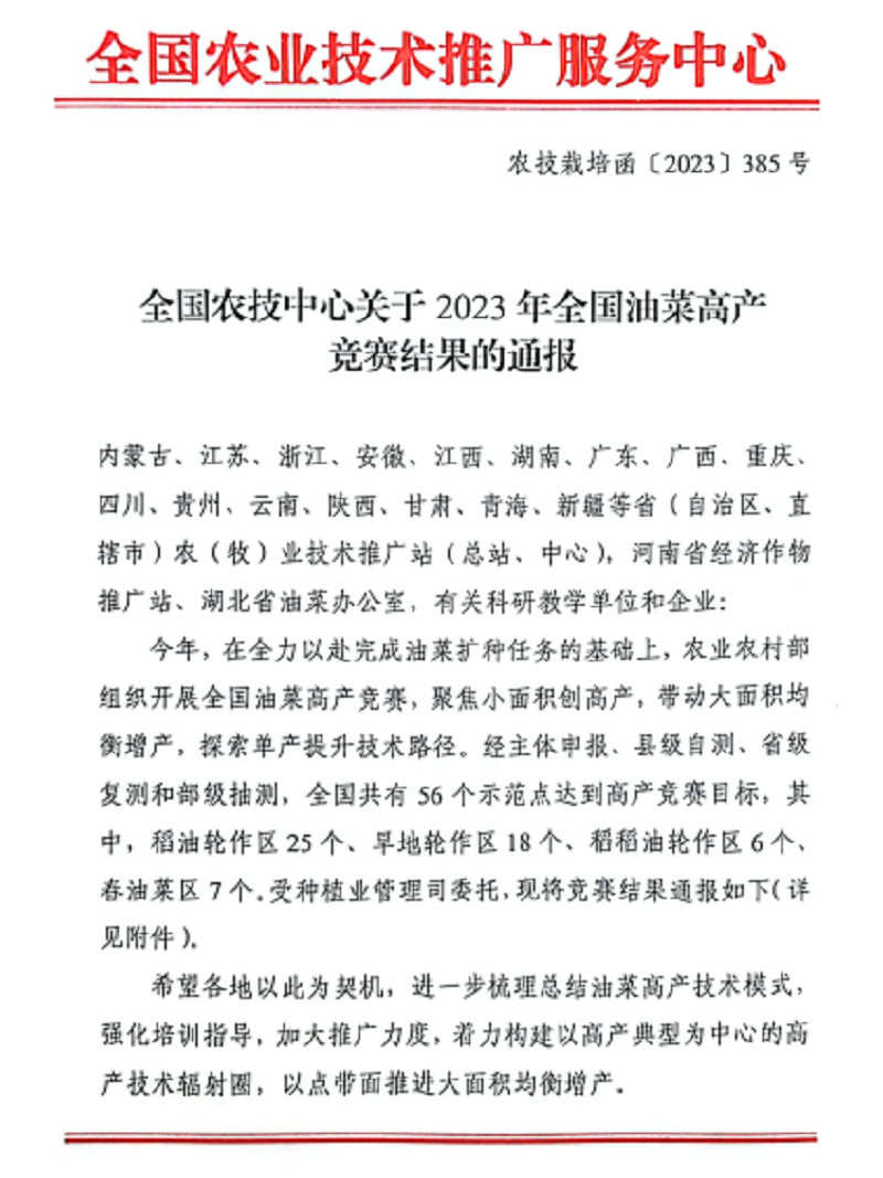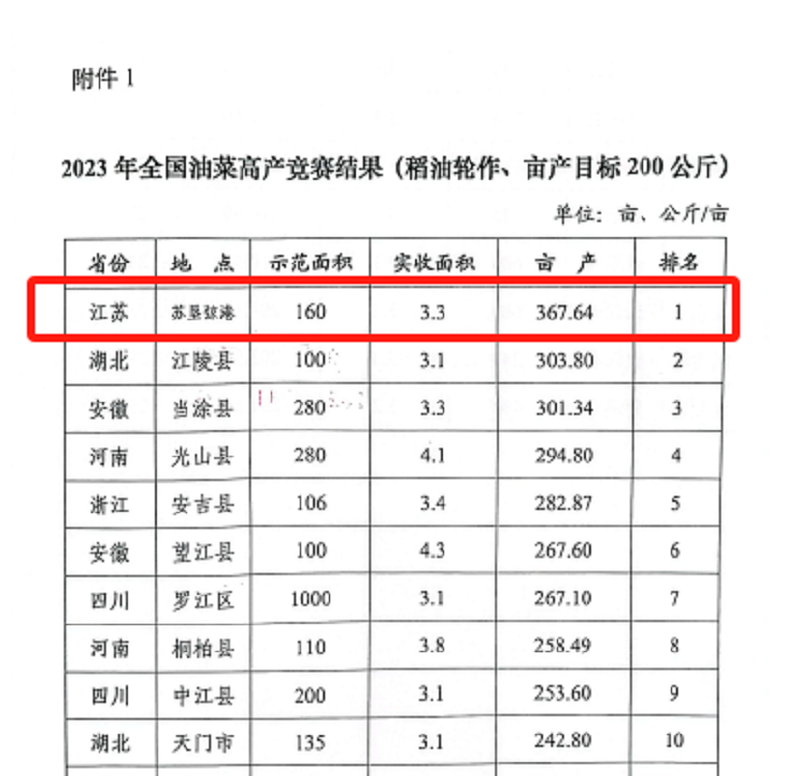 近日,農(nóng)業(yè)農(nóng)村部全國(guó)農(nóng)業(yè)技術(shù)推廣服務(wù)中心公布了2023年全國(guó)油菜高產(chǎn)競(jìng)賽結(jié)果,蘇墾農(nóng)發(fā)弶港分公司百畝攻關(guān)方以畝產(chǎn)367.64公斤刷新全國(guó)稻油輪作油菜高產(chǎn)記錄,較原紀(jì)錄提高43.77公斤,榮獲本次全國(guó)油菜高產(chǎn)競(jìng)賽全組別第一名。