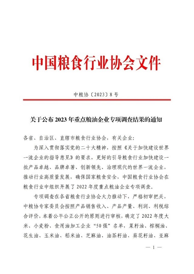 此次專項調查是在各省糧食行業(yè)協(xié)會大力推動下,嚴格初審把關,中糧協(xié)專家委員會按照產品銷售收入、產品產量、利潤、利稅綜合評價,本著公平公正公開的原則進行了審核。此次入圍50強名單的企業(yè),為產品銷售收入達到1億元以上的大米加工企業(yè)、小麥粉加工企業(yè)、食用植物油(含大豆油、菜籽油、棕櫚油等大宗油脂及食用調和油)加工企業(yè),且在最近三年內未發(fā)生過質量安全問題。