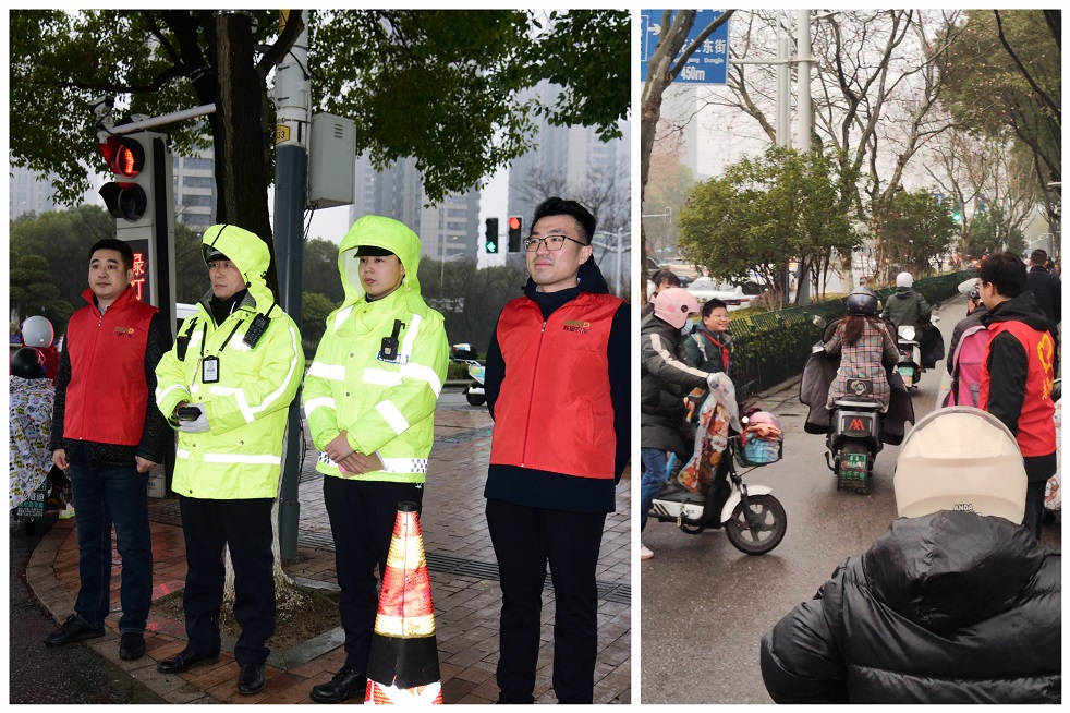 用心“護學(xué)”,為愛“站崗”。每到上學(xué)、放學(xué)高峰期,南師大附屬中學(xué)新城小學(xué)、金陵中學(xué)河西分校小學(xué)部的校門口都很擁堵,車流量大,來往人員眾多?;顒赢?dāng)日,志愿者們不畏嚴寒早早來到校園門口,開展“護學(xué)崗”志愿服務(wù),疏導(dǎo)學(xué)校周邊的車輛和人員,提醒接送孩子的家長不要扎堆,引導(dǎo)放學(xué)的孩子到安全區(qū)域行走,時刻提醒騎電動車、摩托車的家長注意雨天行車安全,確保學(xué)校周邊交通安全有序,為師生、家長的安全出行筑起一道“綠色”通道。