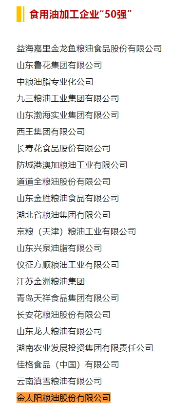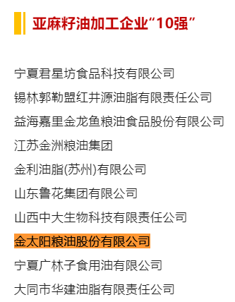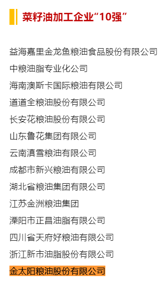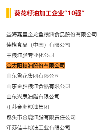 近日,中國糧食行業(yè)協(xié)會根據《關于進行2024年度重點糧油企業(yè)和各省糧油加工業(yè)專項調查的通知》(中糧協(xié)〔2024〕2號),組織行業(yè)專家開展了2023年度重點糧油企業(yè)專項調查,按照產品銷售收入、產量、產能、利稅、利潤等指標綜合審定,公示了2023年度重點糧油企業(yè)專項調查結果。金太陽糧油股份有限公司再度入選食用油加工企業(yè)“50強”、玉米油加工企業(yè)“10強”、稻米油加工企業(yè)“10強”、葵花籽油加工企業(yè)“10強”、亞麻籽油加工企業(yè)“10強”等5項榜單,首次入選菜籽油加工企業(yè)“10強”榜單。