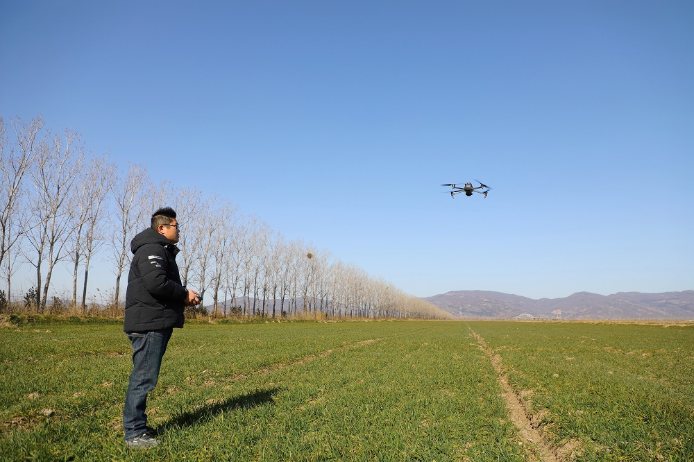 在西洋生產(chǎn)區(qū)20大隊,隊長魏峰正在使用無人機進行智能巡田?!敖谑芾淇諝庥绊?,氣溫持續(xù)下降,利用無人機巡田可以全方位、無死角地把麥田圖像拍攝下來,便于后期科學精準地開展施肥、灌溉、除草等作業(yè),減少用工成本,提高作業(yè)質量,1個人1天時間便可完成1萬畝小麥巡田工作,田間管理變得既高效又輕松?!蔽悍褰榻B道。