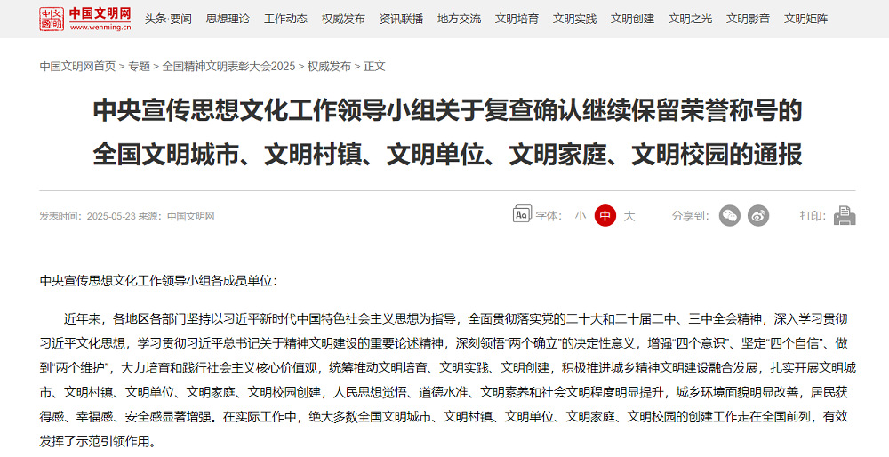 5月23日,中央宣傳思想文化工作領(lǐng)導(dǎo)小組公布《關(guān)于認(rèn)定命名第七屆全國(guó)文明城市、文明村鎮(zhèn)、文明單位和第三屆全國(guó)文明家庭、文明校園的決定》和《關(guān)于復(fù)查確認(rèn)繼續(xù)保留榮譽(yù)稱號(hào)的全國(guó)文明城市、文明村鎮(zhèn)、文明單位、文明家庭、文明校園的通報(bào)》。蘇墾農(nóng)發(fā)順利通過(guò)復(fù)查評(píng)估,繼續(xù)保留“全國(guó)文明單位”稱號(hào),這是繼2020年首創(chuàng)首成第六屆“全國(guó)文明單位”后又一次獲此殊榮。